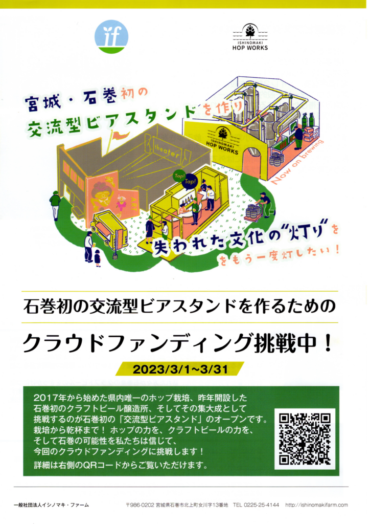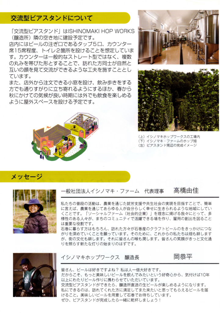 石巻の中心地、文化通りには60年以上も市民に愛された映画館があったそうです。東日本大震災後、わずか3ヵ月で再開させた伝説の名物支配人がいらっしゃったそうですが、2017年に逝去されたことで閉館となってしまいました。一般社団法人イシノマキ・ファームさんは文化の灯を失くしてはいけないと、その跡地に醸造所を作り、今度は併設する交流型のビアレストランをと、クラウドファンディングに挑戦しています。「希望」という花言葉を持つホップから造るクラフトビールを提供する交流型ビアレストランというから、多くの人の夢や希望がたくさんつまった事業なのでしょう。