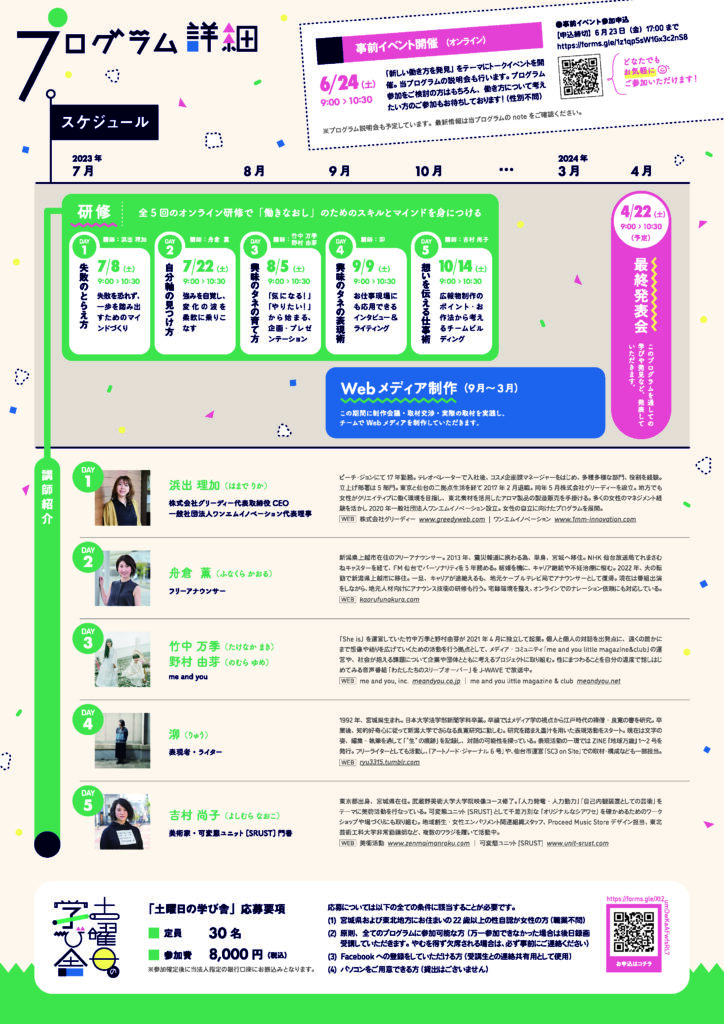 土曜日の学び舎は「全5回の研修」+「Webメディア制作」のプロジェクト型プログラム。