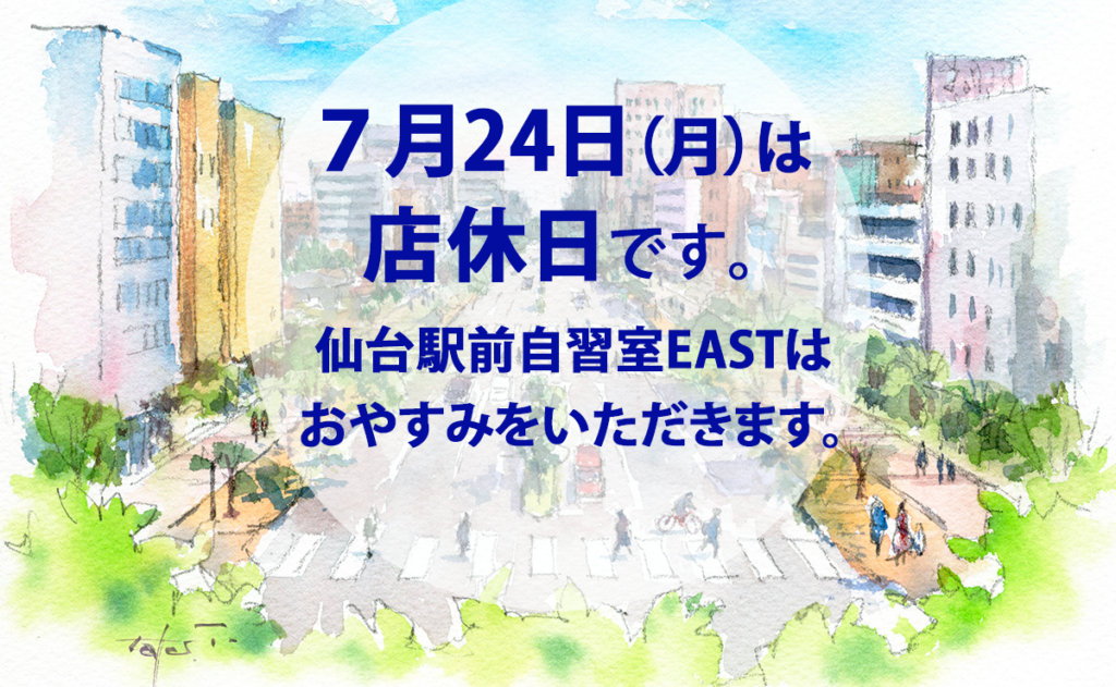 仙台駅前自習室EASTは明日14日(金)、お休みをいただきます。 通常は第2、4月曜日が店休日ですが、明日はお休みとなりますので、お間違いのないようによろしくお願いいたします。 高校生の方に「いつから夏休み?」とたずねると早い学校は来週から夏休み... -