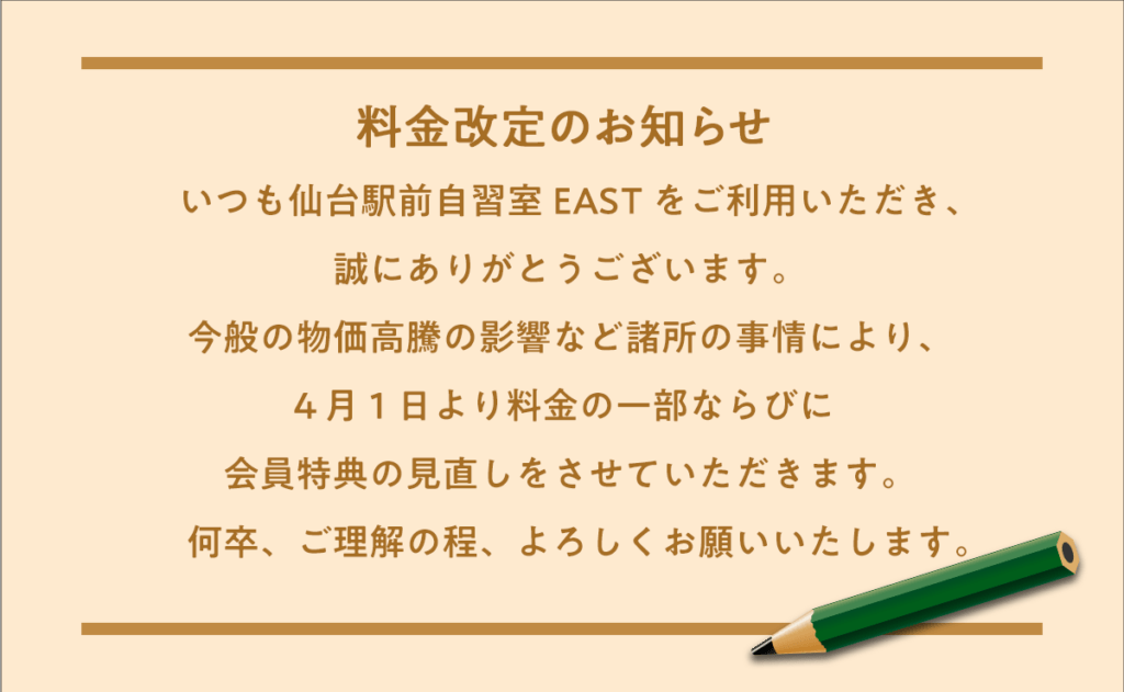 当自習室では今般の物価高騰の影響など、諸所の事情が重なり4月1日より『一部料金の改定』ならびに『会員特典の見直し』をさせていただくことに致しました。 改定点は以下になります。 会員につきましては定員を設けさせていただきます。定員枠が埋まっ... -