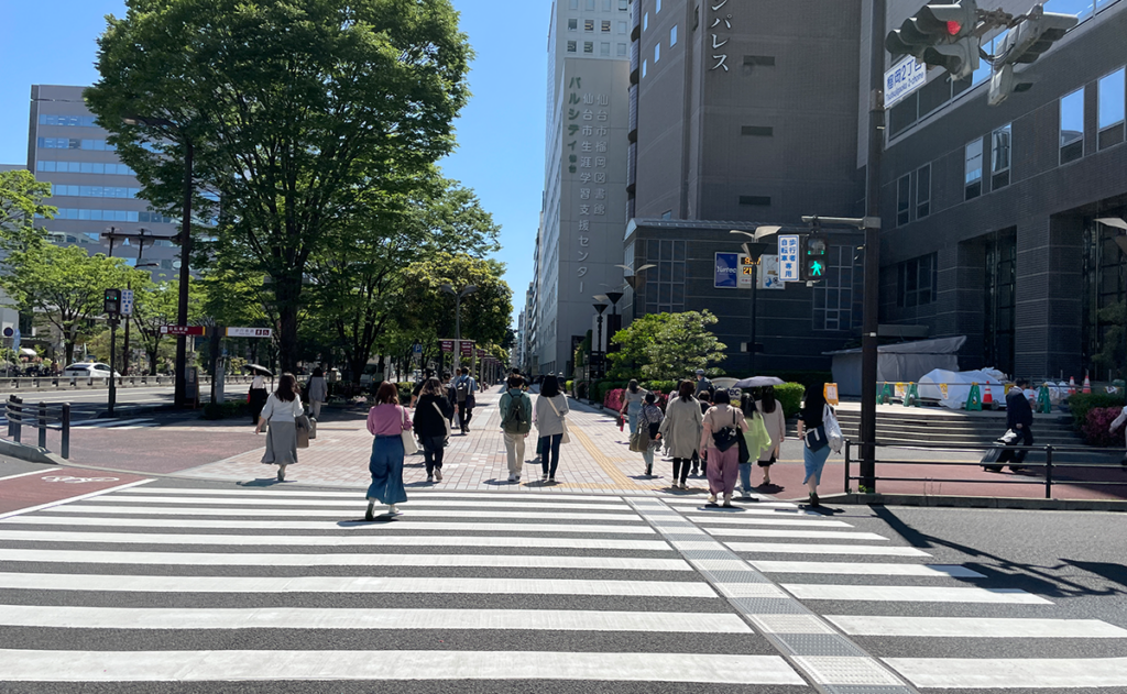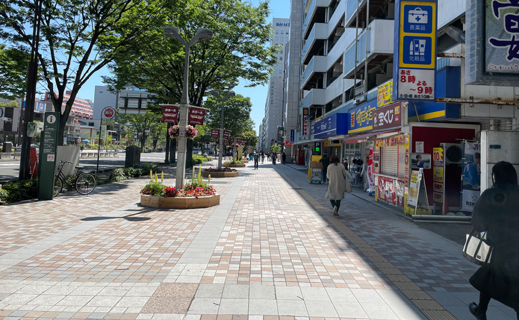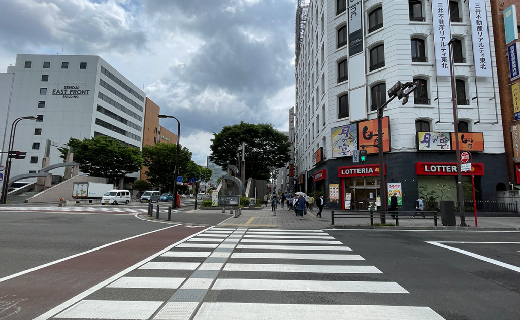 左手をみますと、駅から楽天生命パークまで伸びる「宮城野通」です。ここら辺は歩道も、車道もゆったりしてます。歩道と車道の間には、自転車の専用道路もあります。
