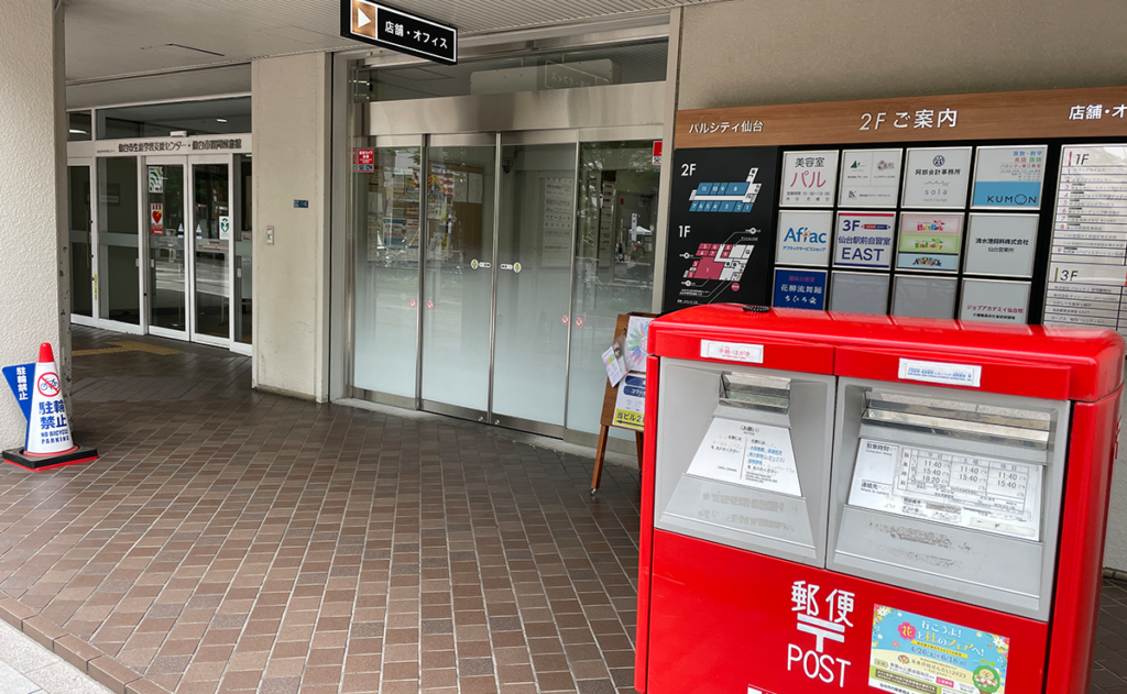 ⑫その隣に、白い7階建てのビル。壁面にグリーンの文字で「パルシティ仙台」白い箱文字で「仙台市榴岡図書館」と「仙台市生涯学習支援センター」の文字が見えます。