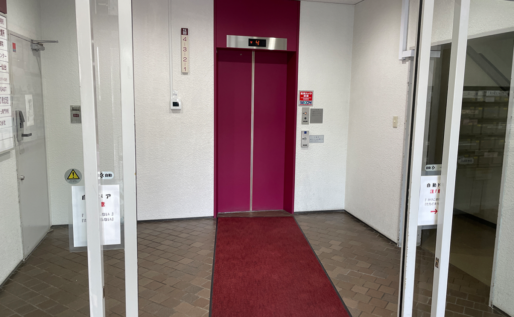 ⑯店舗オフィスの入り口を入ると正面に、エンジ色したエレベーターが見えます。これに乗って3階です。3階まで来ればもう安心です。長い通路に「仙台駅前自習室EAST」の看板が見えます。