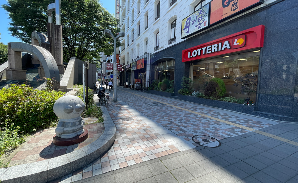 ⑧すると信号をひとつスルーしてロッテリアの角に出ます。左手に見えるアンパンマンの像が目じるしです。